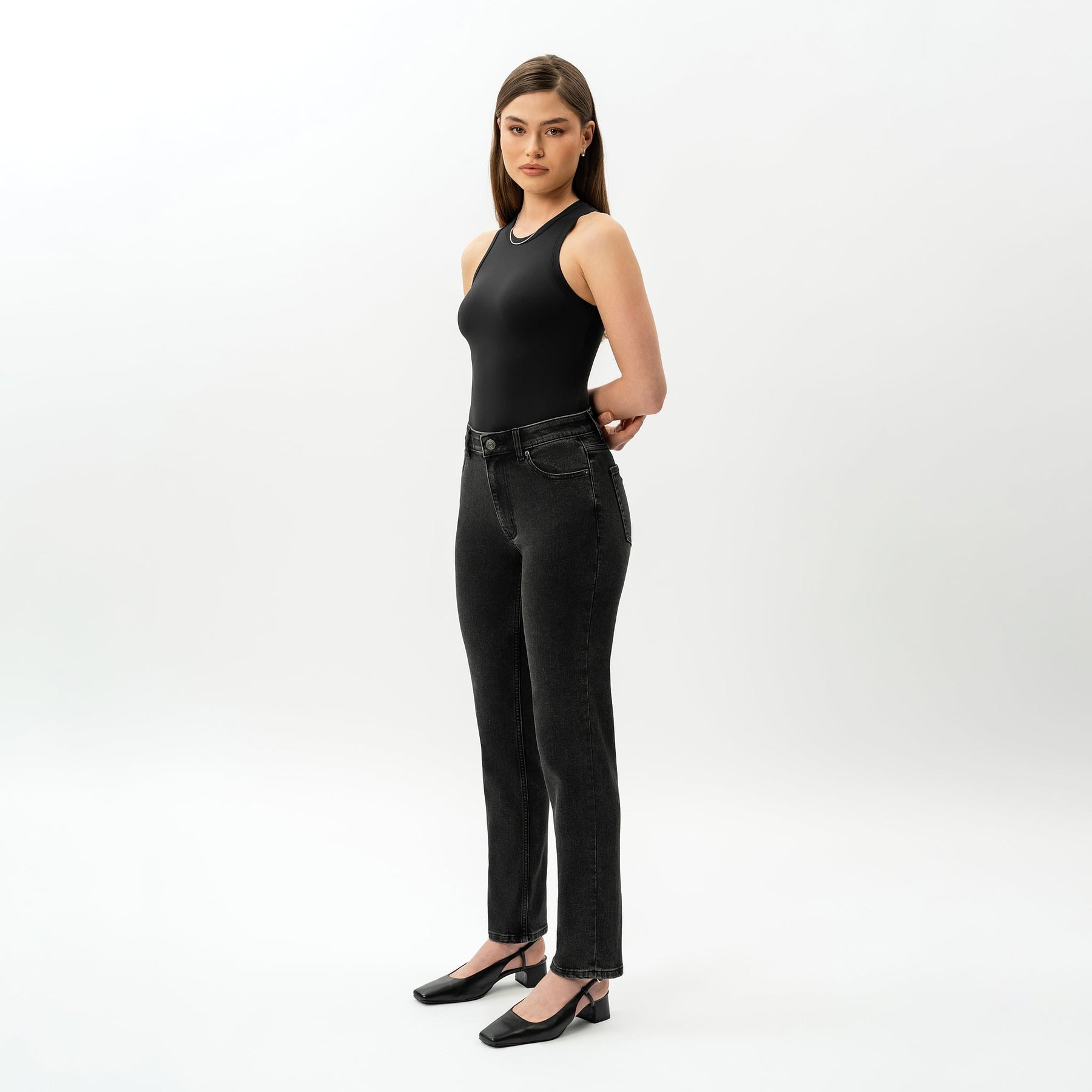 Experience the classic look of denim with the comfort of incredible stretch. Our high-waisted, straight-leg slim jeans are crafted from a proprietary denim blend that’s both very stretchy and thick, providing the feel of traditional denim with added flexibility. Versatile and perfect for everyday wear, these jeans are a must-have in your wardrobe.