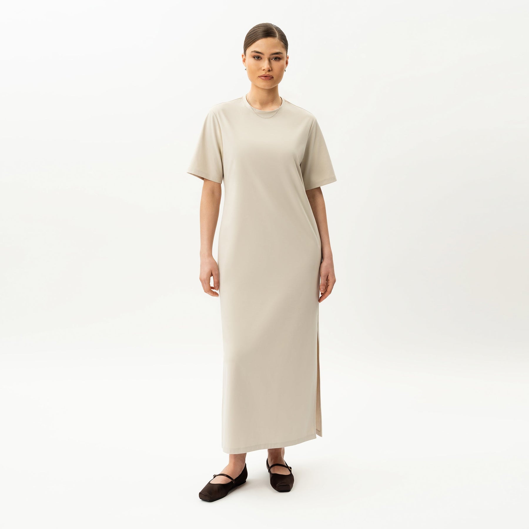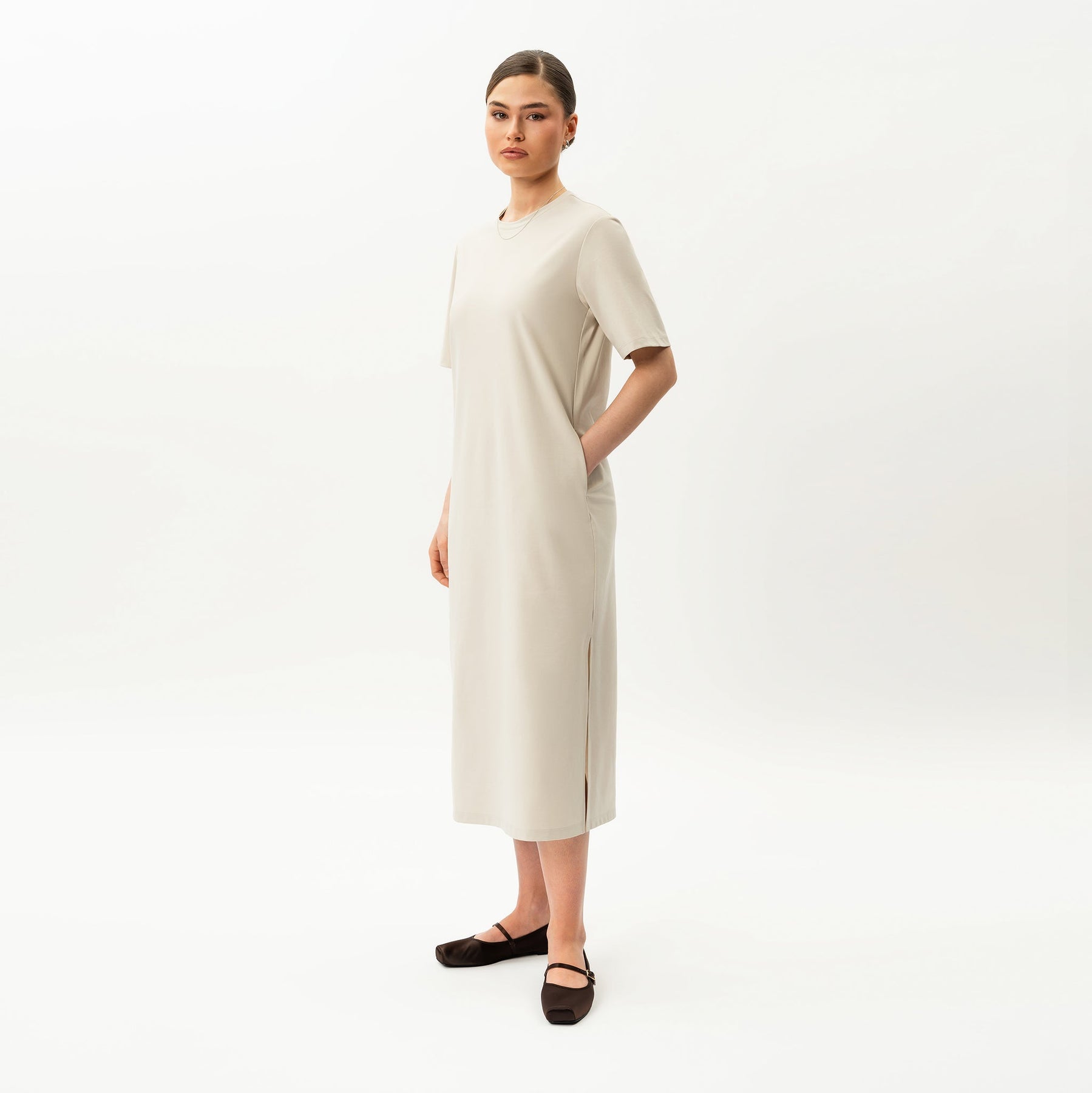 This is the dress you’ll reach for again and again. Made from a soft, breathable cotton blend, it has a relaxed fit with subtle shaping and side slits for easy movement. Designed to dress up or down, it’s a versatile staple made for comfort and ease.